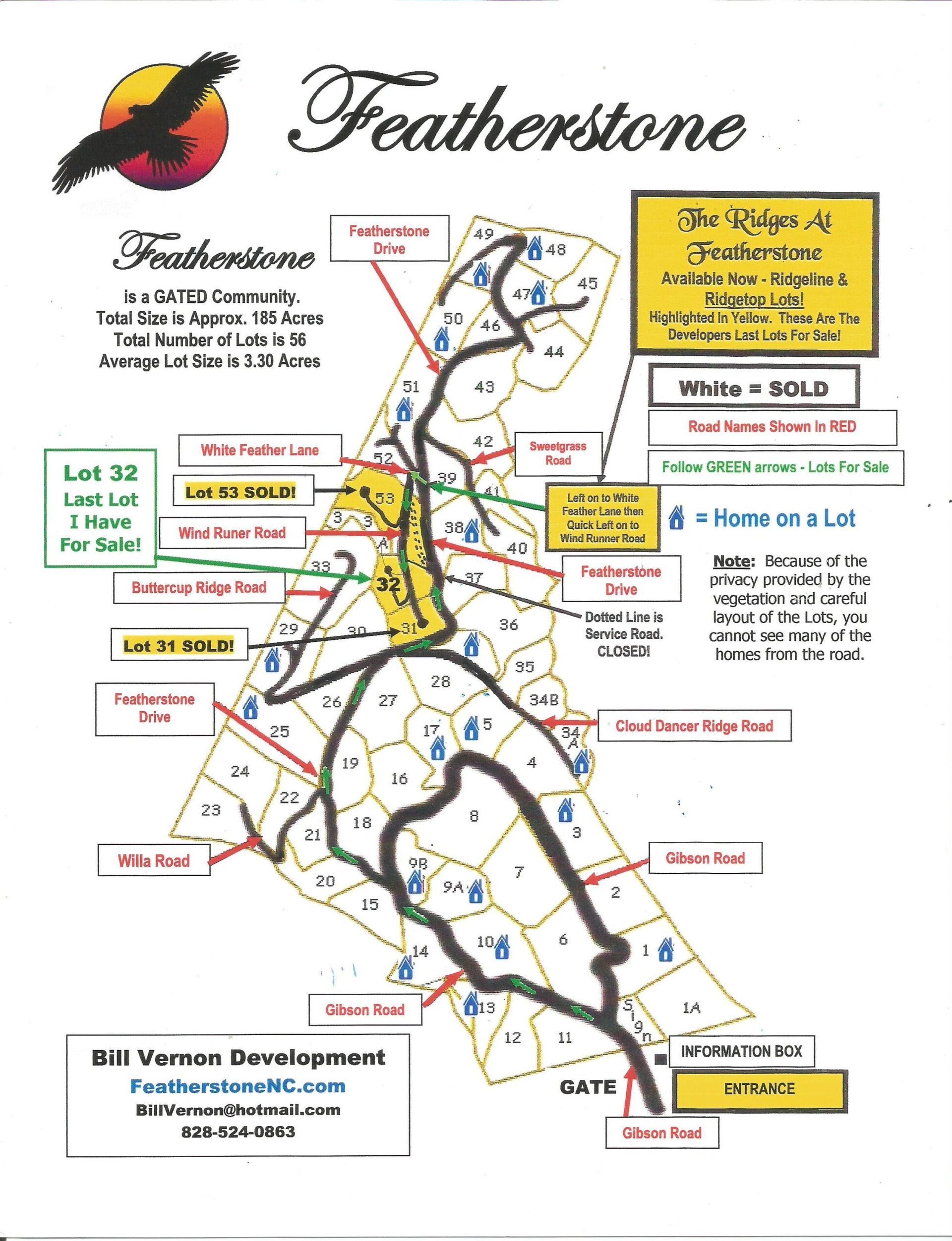 Located just outside of the Town of Franklin in Macon County, North CarolinaFrom Franklin, take Highlands Road (Hwy 64 E) towards Highlands. Turn Right on Fulton Road (just before Bill’s Aluminum)Turn Left on Gibson Road (approximately 7/10ths of a mile)Gibson Road takes you into Featherstone.